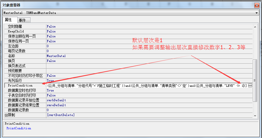 易投软件报表中输出层次的设置方法易投软件报表中输出层次的设置方法 1 工程概算总表、总概算表输出层次的设置方法 打开 工程总造价窗口=》输出层次选择设置(如图1层显示) 二、主要工程量汇总表、主要材料量汇总表输出层次的设置方法 报表编辑中设置:1、进入报表编辑窗口 2、点 主项数据 右键=》进入属性 3、进入 对象查看器 找到PrintCondition 行,在LEVE<= 1 中修改数字比如 1、2、3等 对应的数字代表输出的层次。然后切换行,退出关闭窗口。保存报表 4、预览查看报表。