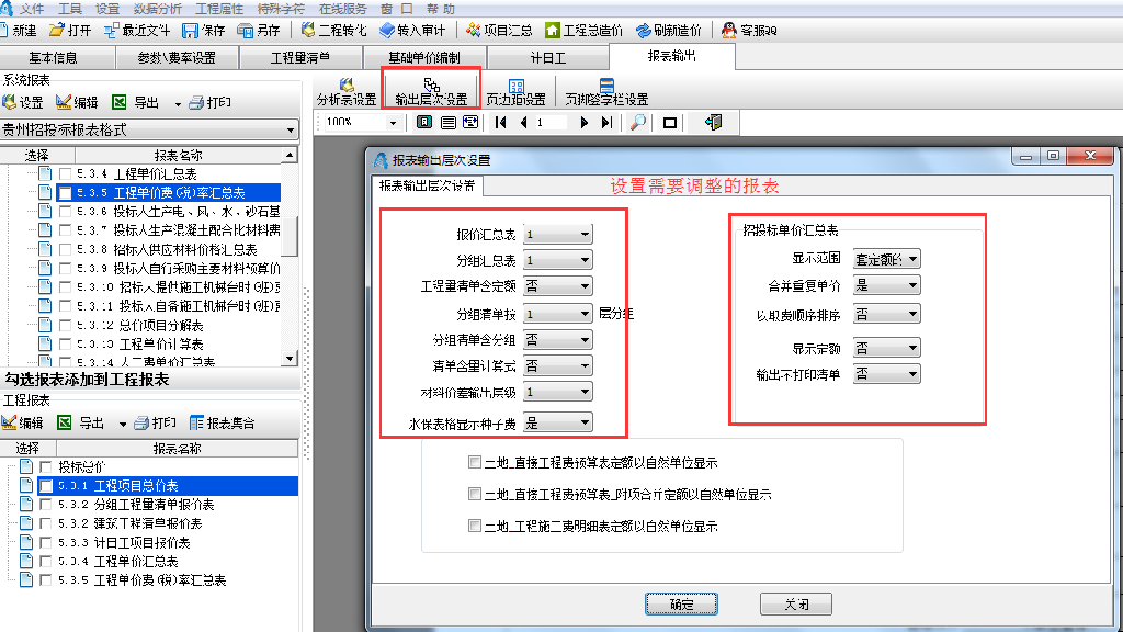 三、投标项目中 报价汇总表和其它清单报价表等输出层次的设置方法 报表输出窗口=》进入 输出层次设置 根据需求设置要调整的报表进行设置