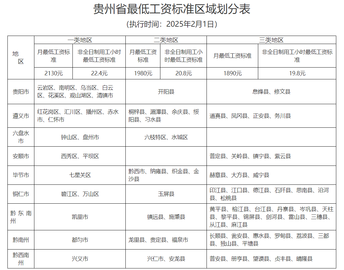 附件:贵州省最低工资标准区域划分表