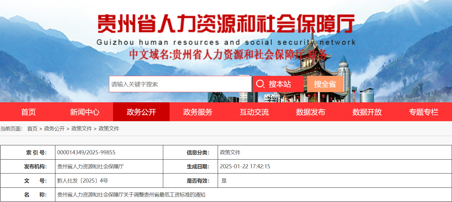 本次调整的最低工资标准从2025年2月1日起执行。2022年印发的《贵州省人力资源和社会保障厅关于调整贵州省最低工资标准的通知》(黔人社发〔2022〕31号)同时废止。
